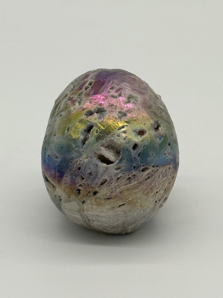 Carved from natural sphalerite and finished with an iridescent aura coating, each piece flashes with deep purples, blues, and greens layered over raw druzy sparkle.